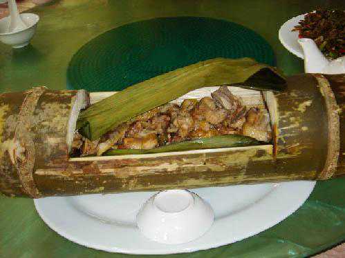 是哈尼族的一道名菜。其作法是:将肉洗净剁细,把姜、辣椒、野花椒、盐等佐料切细与肉拌匀,然后放进预先准备的一节竹筒里,用芭蕉叶塞住筒口,放到火炭里烧熟即可食用,味道鲜美,清香适宜。
