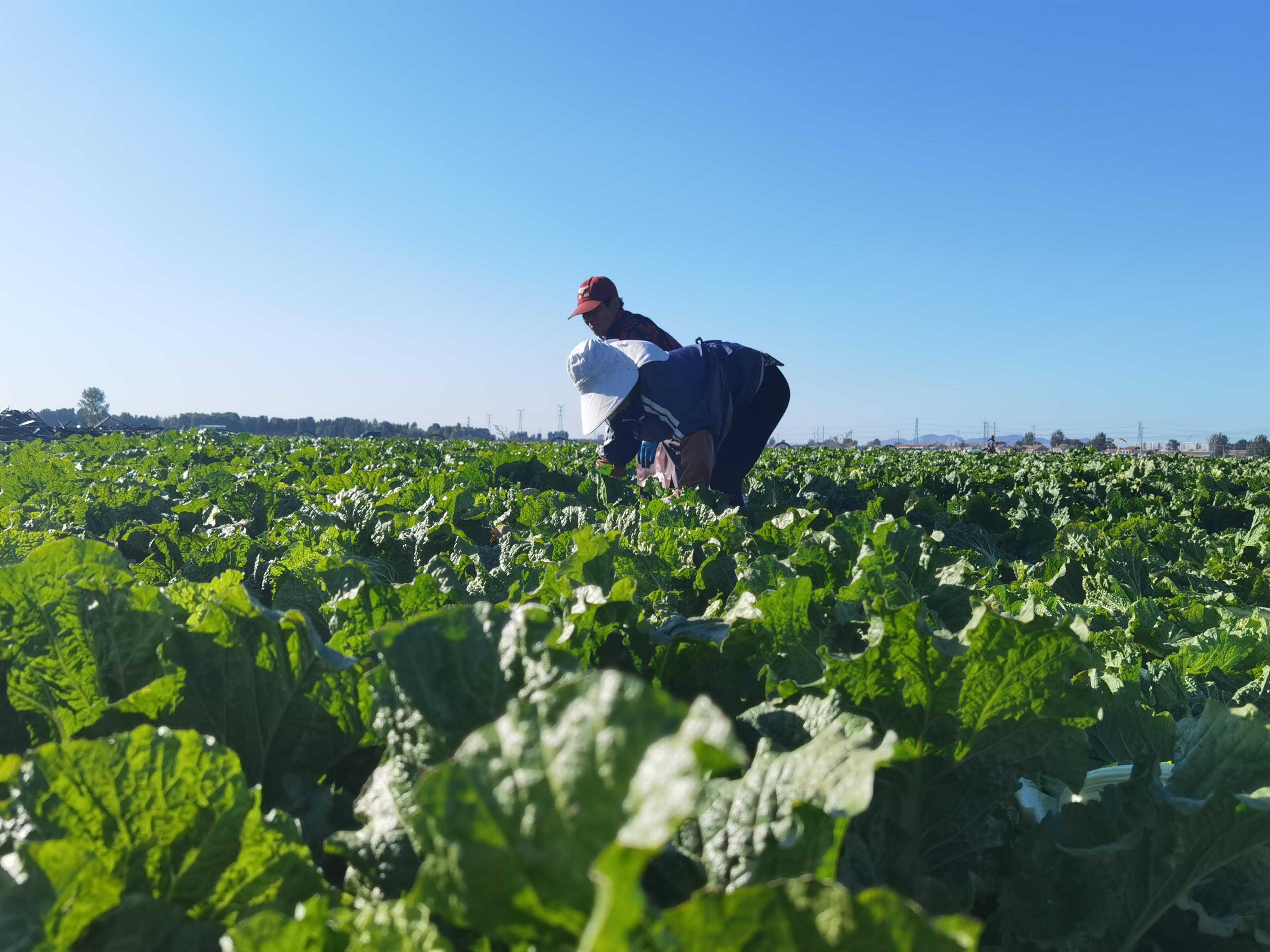 10月21日,河北省唐山市玉田县供京蔬菜万亩基地里,农户正在采收大白菜。新京报记者曹晶瑞摄
