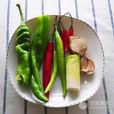 2、食材准备:青椒1个/红辣椒1个/绿辣椒2个/小米辣4个/大葱1段/姜1块/蒜2颗
