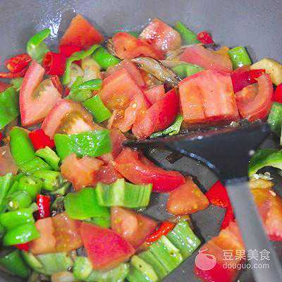 11、加入青椒+西红柿,继续煸炒至西红柿微微变软
