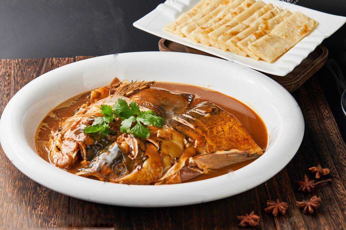 鱼头泡饼是北京的传统美食。鱼头先炸后用葱、姜、酸、干辣椒等翻炒,再加入汤、酱油、番茄酱等烹煮。