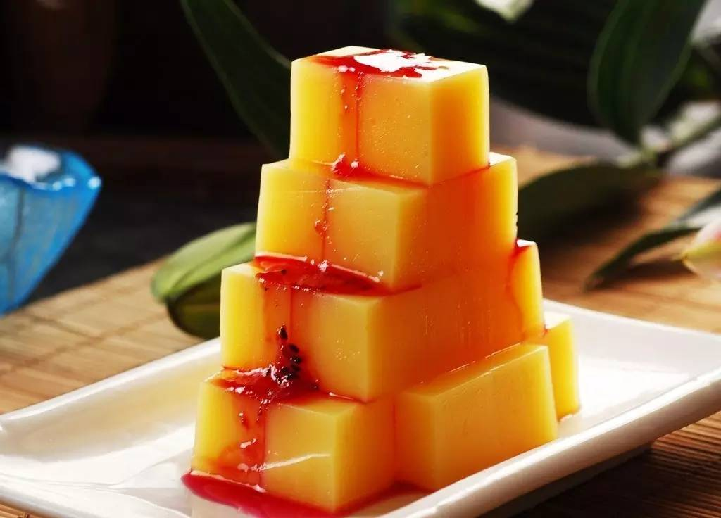 豌豆黄过去是春季的应季点心,由豌豆、白糖等混合而成。豌豆黄呈淡黄色,吃起来柔滑清凉。