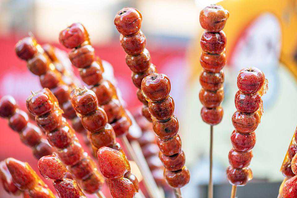 糖葫芦在北方都很常见,但是“北京糖葫芦”已经成为一个招牌。糖葫芦的做法也很简单,只需要把山楂裹上煮好的麦芽糖稀,放凉凝固即可食用。