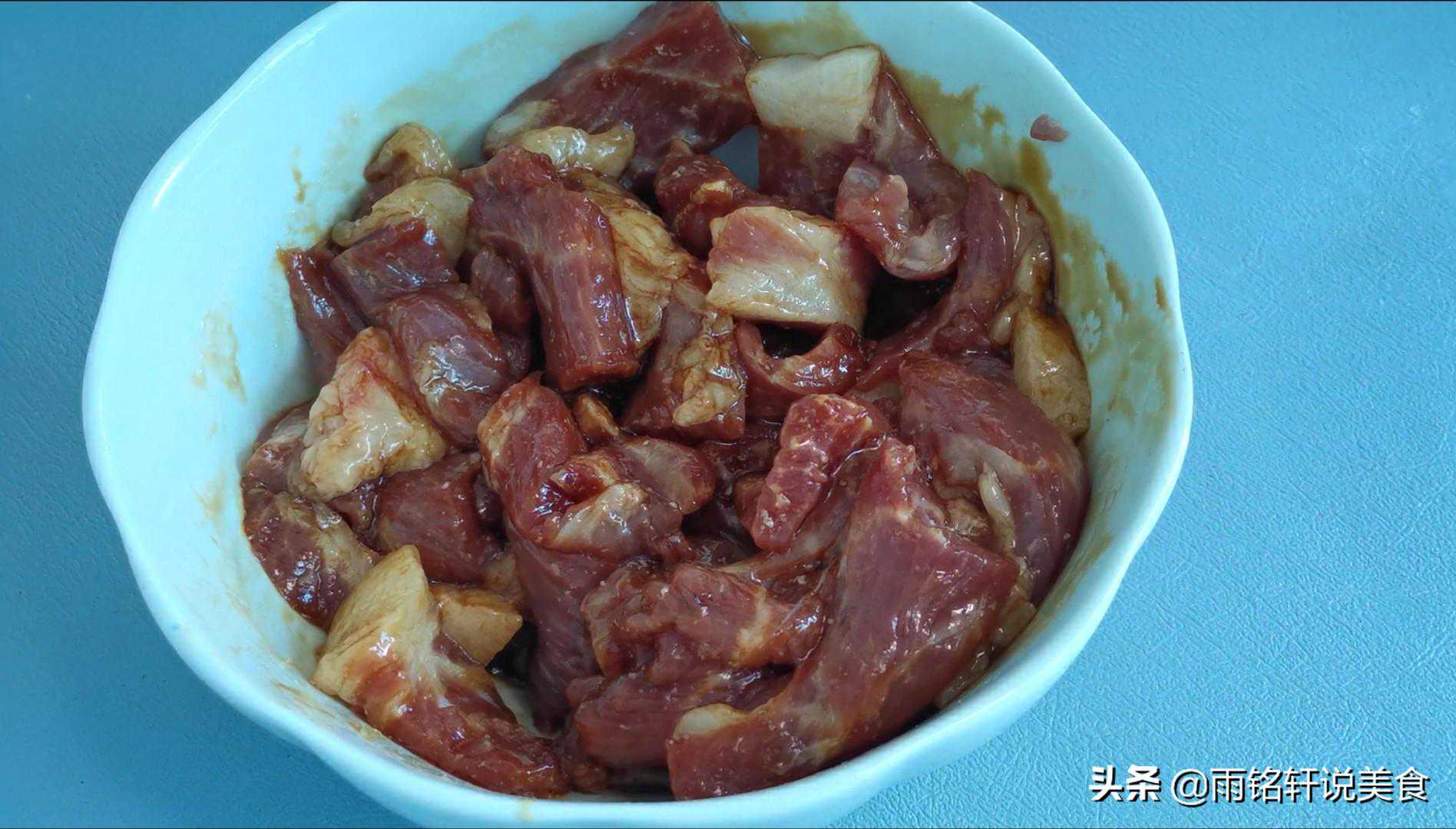 第一步:提前准备食材,糯米提前浸泡4个小时以上;绿豆清洗干净倒入高压锅里,倒入适量的清水没过绿豆,把绿豆煮开花即可盛出放碗里备用;准备一块猪的梅花肉,洗干净切小块放碗里,调入一勺生抽、蚝油、料酒、一小勺盐,用筷子充分的搅拌均匀再腌制30分钟。