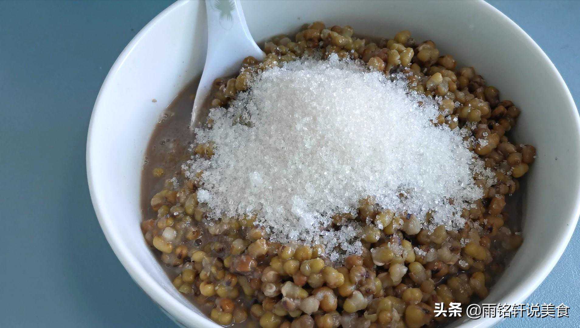 第二步:煮好的绿豆倒入50克白糖,然后倒入锅里,开中小火一边搅拌,一边把它压成泥状,把它的水分炒干即可出锅。