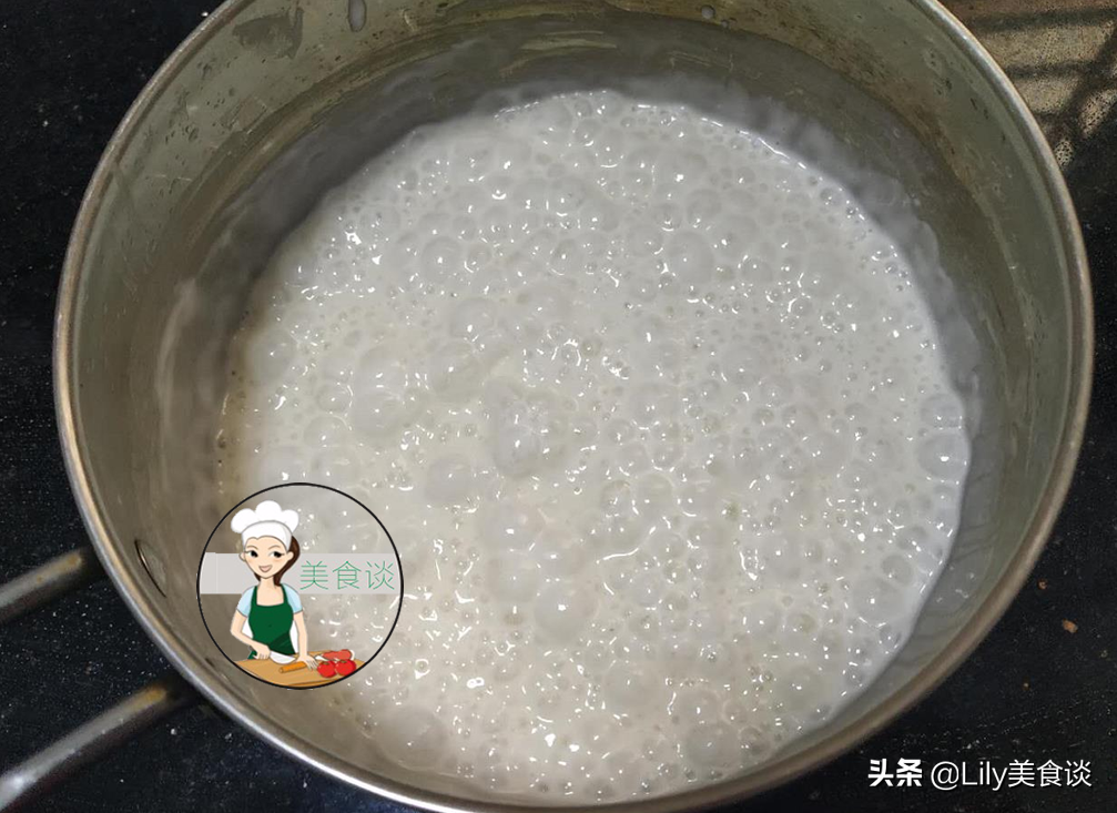 6、出现面疙瘩时关火搅拌至疙瘩消失,在加热至有点粘锅底,然后离火搅拌至疙瘩消失,重复2次此动作,煮至面糊呈粘稠状即可。将煮好的面糊放至冷却待用。