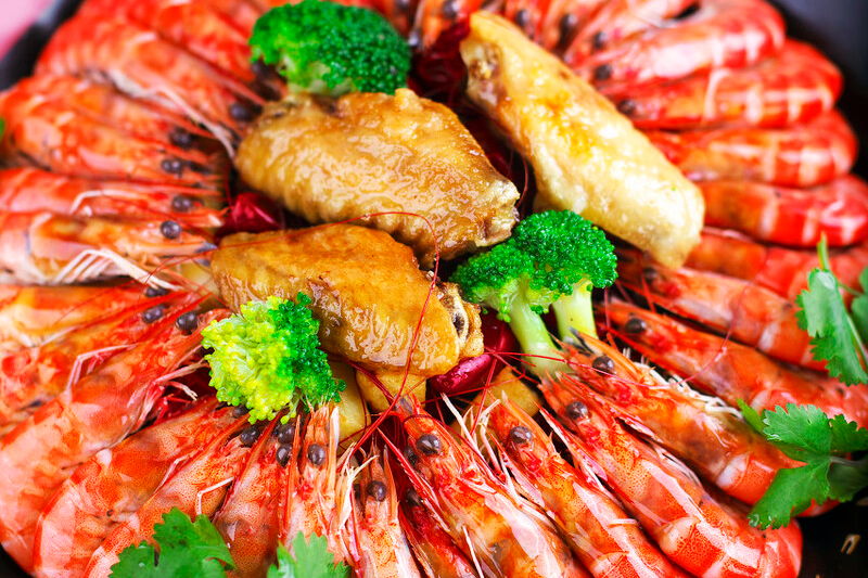 〖食材清单〗虾、鸡翅、西蓝花、干辣椒、洋葱、姜片、花椒、葱蒜、鸡粉、豆瓣酱
