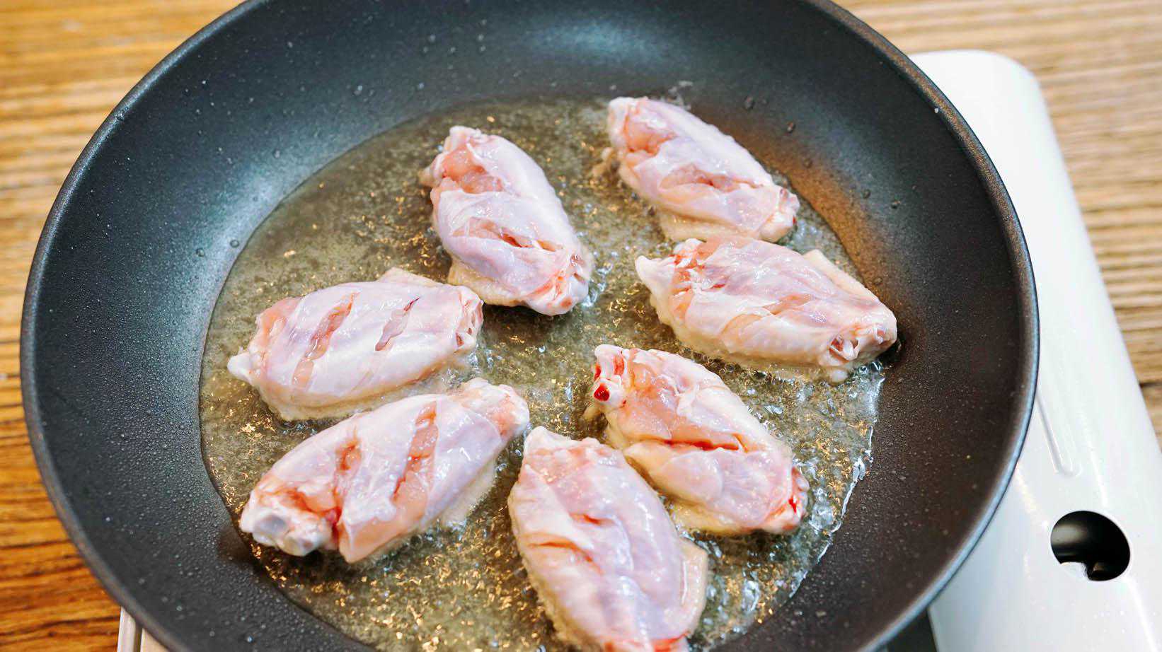 3、锅里倒菜籽油,烧制七成热,放入鸡翅小火慢慢煎至,一面炸制金黄色后翻面炸制,期间一定要用筷子时不时地翻动下鸡翅,以免粘锅,炸到金黄色就可以出锅了;
