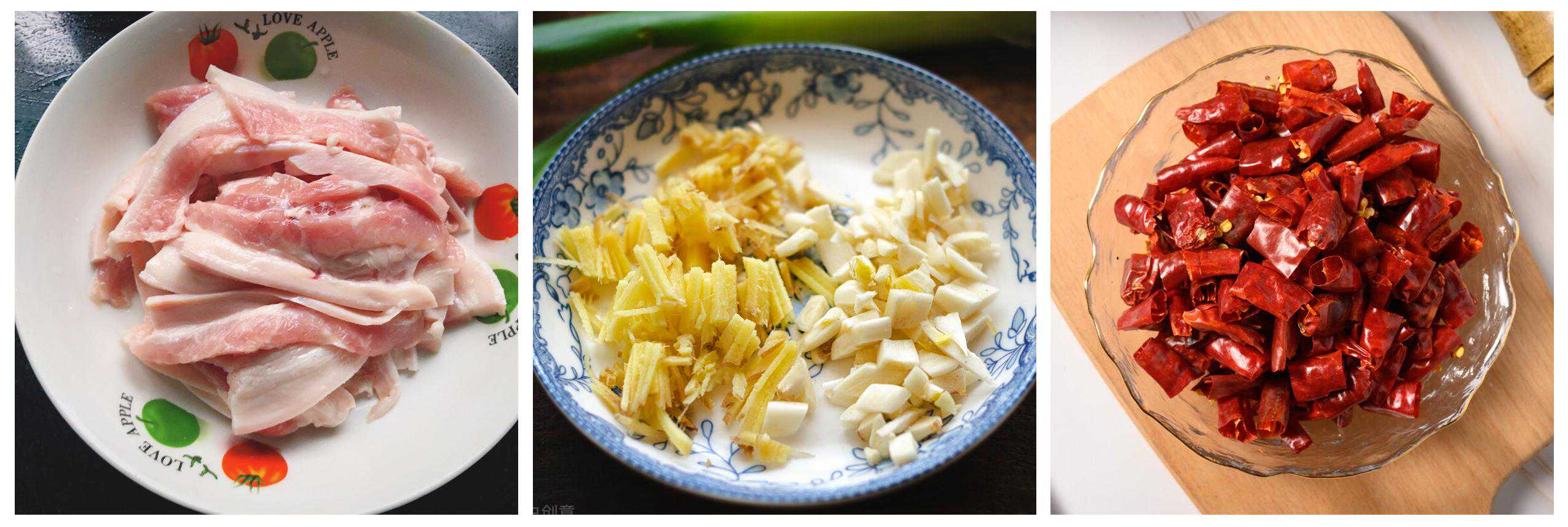 2、五花肉切片、姜蒜切细、青红辣椒切圈、干辣椒切段备用;