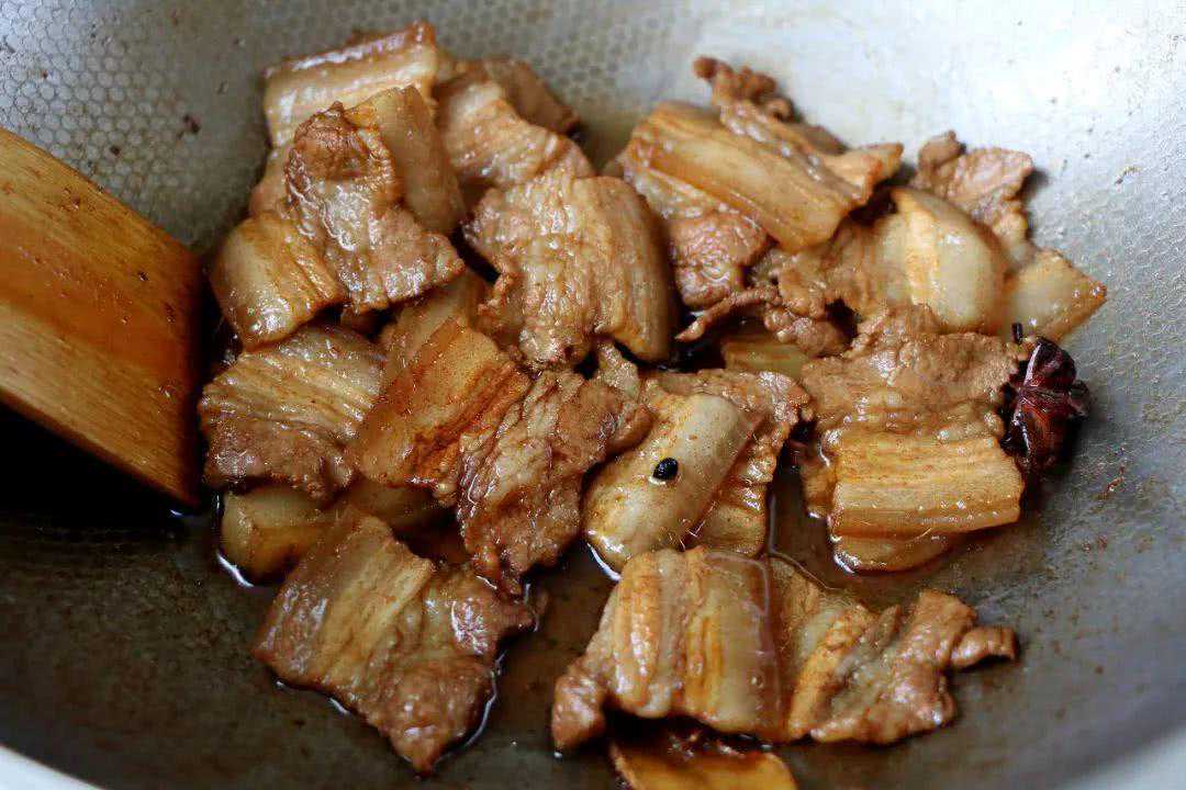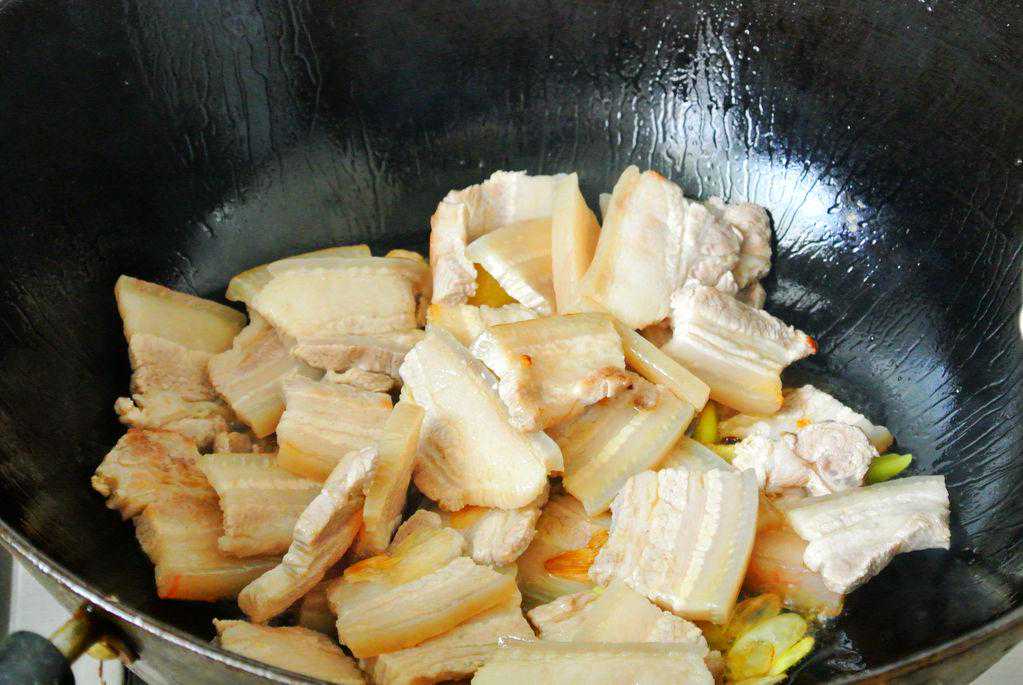 3、热锅热油,放入五花肉翻炒至微焦,加生抽、老抽翻炒,然后留油把五花肉捞出备用;