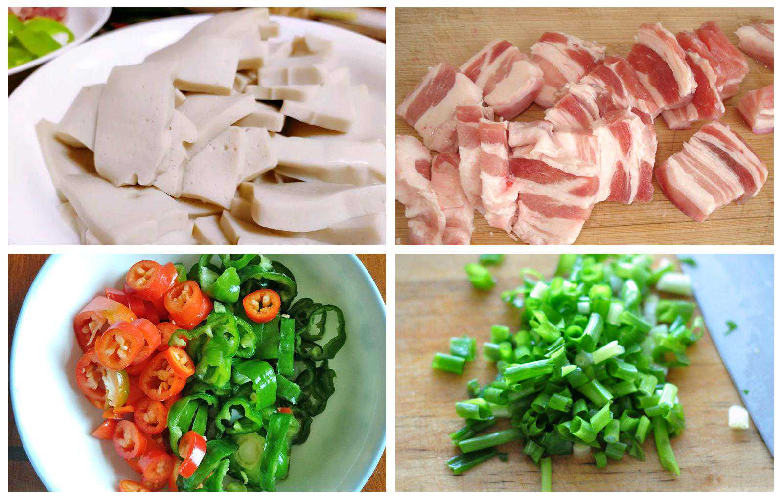 1、千页豆腐切薄片;五花肉切片、青红辣椒切圈、葱切葱花备用;