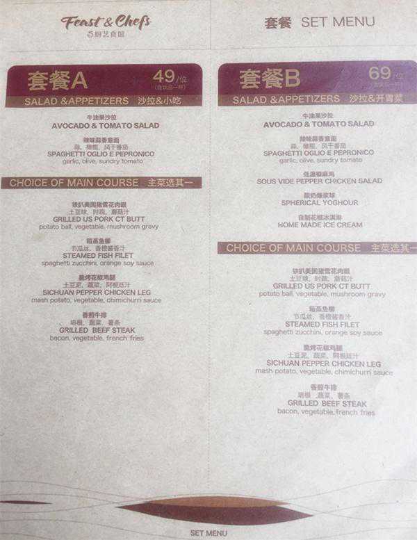 木浆纸质菜单对菜品原料的介绍也很详细,到店顾客可以根据自己对食物的喜好选择餐点,减少了上菜后因为菜品中某样事物不合胃口的概率。值得一提的是餐厅针对美食爱好者推出了价格令人屏息的午市套餐以及品种多样的晚餐套餐。不同于其他家西餐厅高高在上的价格,人均价格49—100元令人咋舌。