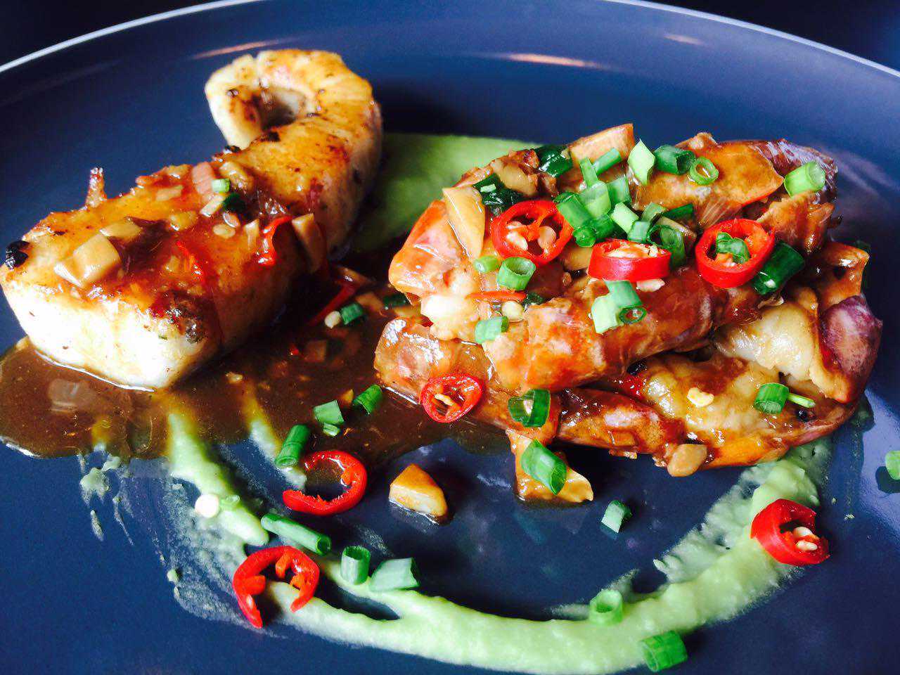 青豆泥、阿根廷红虾、加拿大鳕鱼、火腿浓汁这些典型的西式原料配上精选本地小米椒、小香葱以及秘制酱油等中式调料,口味咸鲜微辣,西菜中做,意料之外的和谐。