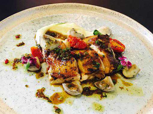 西班牙红粉、香草、花椒来腌制鸡腿,配上柠檬汁、酱油、薄荷叶、紫苏叶等原料制成的融合酱汁,煎烤等方法让鸡皮香脆,鸡肉因为提前腌制十分入味,回味香麻。