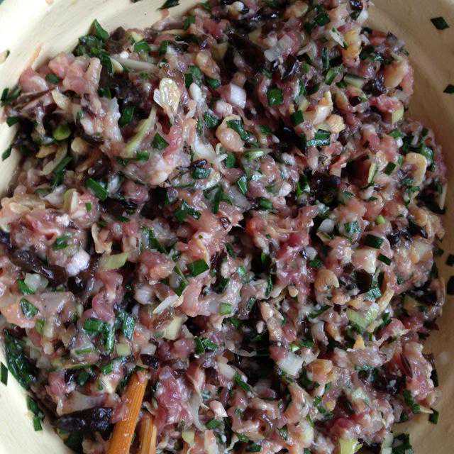 食材:鲜猪肉300克、虾仁50克、海米、虾皮少许盐、耗油少许、韭菜、香椿一小把、食用油少许、鸡汤100克、水发木耳小半碗;