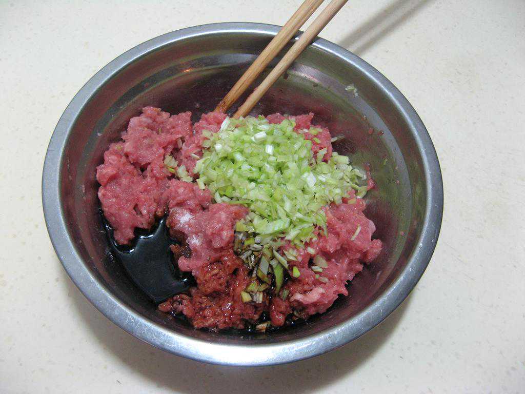 2.大葱切末,与肉馅同入一盆,根据口味调入生抽、酱油、盐,可以加点清水,使肉馅更加软和、滋润,充分混合均匀,腌制20分钟左右,入味即可。