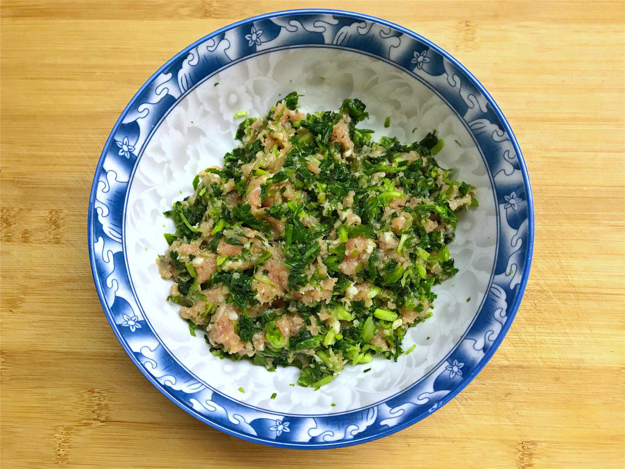 3.青菜控干水分后剁碎,拌入肉馅,到香油拌匀即可