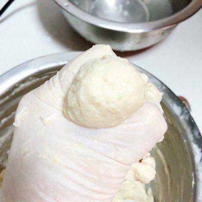 6、做一锅冷水,鱼肉泥旁边放一盆水(勺子攒水用),用左手抓鱼泥,捏一下虎口会出来一块鱼泥,第一次捏出的鱼泥肯定不够圆润,再将手松一下让鱼泥收回手里,再次捏出鱼泥,再收回去,第三次捏出的鱼丸你会发现比较圆润,这时用右手拿不锈钢勺子攒一下水挖下这块鱼泥放入锅里的冷水中。