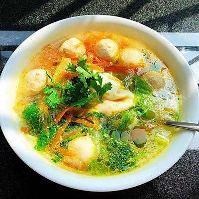 13、今天做了杂蔬鱼丸鸡蛋汤,鲜美可口,色香味俱全。