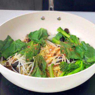8、VELOSAN德国悬浮鹅卵石炒锅倒入少许植物油,放入青菜、娃娃菜、豆芽、绿腐竹、木耳、金针菇、蘑菇;