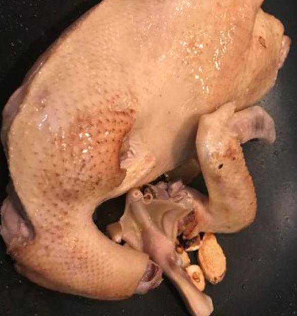 起锅烧水,把鸭子冷水下锅,再放入姜,葱白一起焯水,大概8~9分钟左右,然后把焯完水的鸭子取出来,擦干水分放碗中干备用。