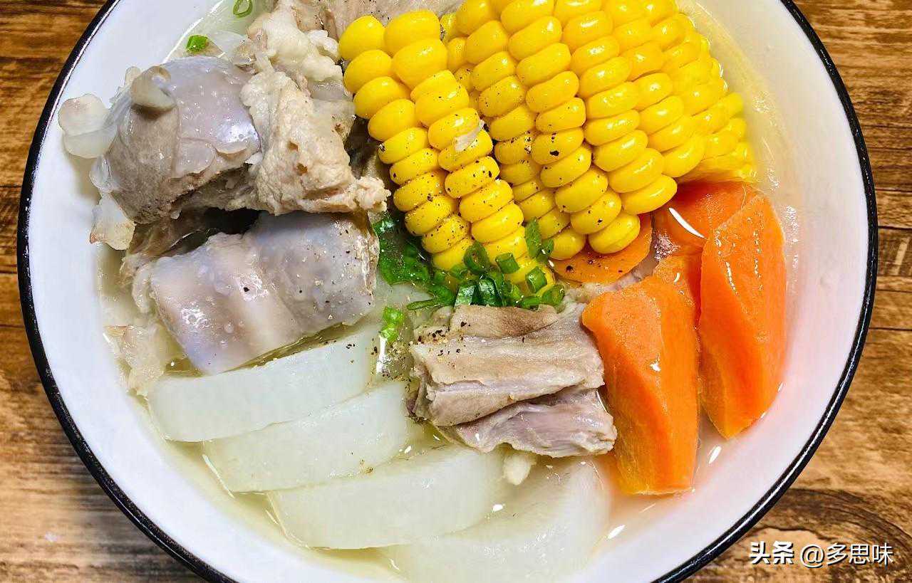煲汤加整个玉米/胡萝卜/白萝卜的份量适合4人用餐,若为2人用餐可将配料分两份,一次只放一半,第二次用餐时现煮,口感更佳。不然未食用完毕的配料长时间放在汤中,影响汤底颜色和口感。