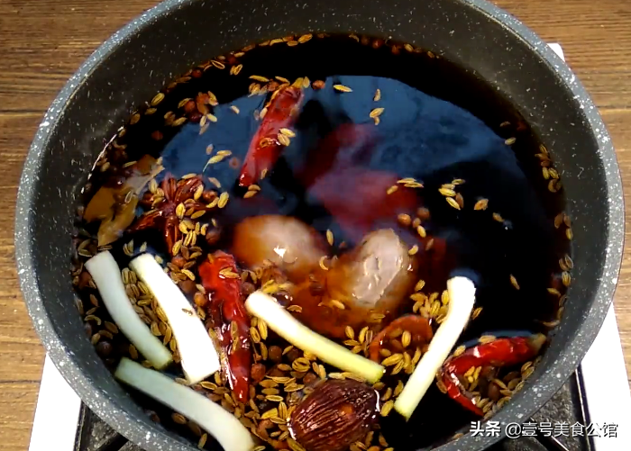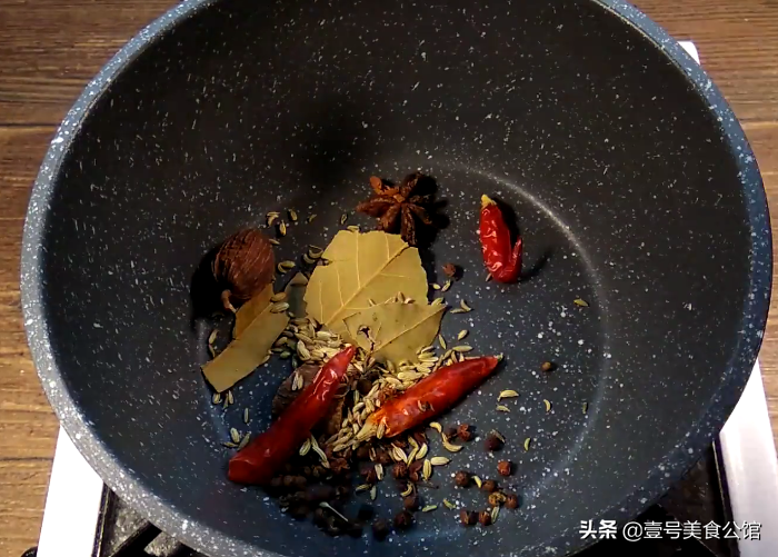 第二步:把准备好的桂皮,八角,香叶,花椒,干辣椒,炒果,小茴香倒入一个炖锅中,无须加油加水,中小火干炒一分钟,只需炒出微微的香味即可。