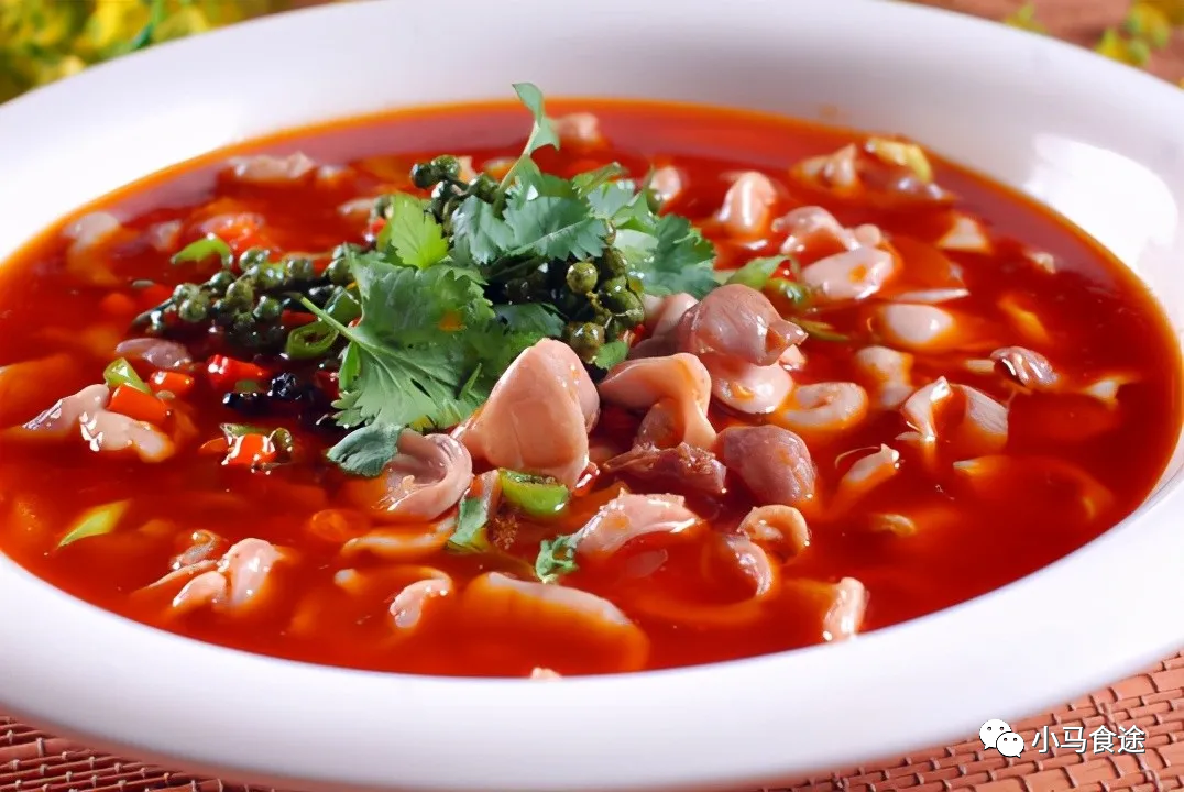 3.热锅下油烧热,下入豆瓣、姜米炒香,掺鲜汤,调入盐、酱油、料酒、胡椒,下入蔬菜煮断生捞出盛入盆里。下入兔肚,水豆粉勾芡,然后连汤倒入盆中。