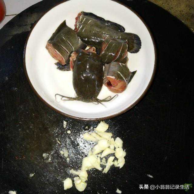 1、将钓回来的塘角鱼去除内脏清洗干净,然后砍成小段,蒜拍成末备用。