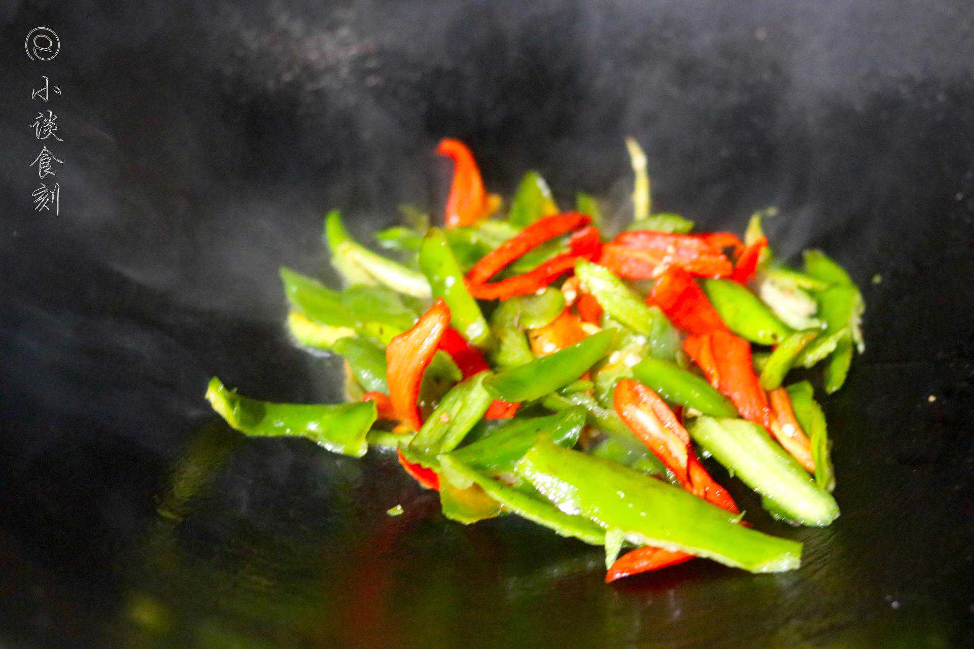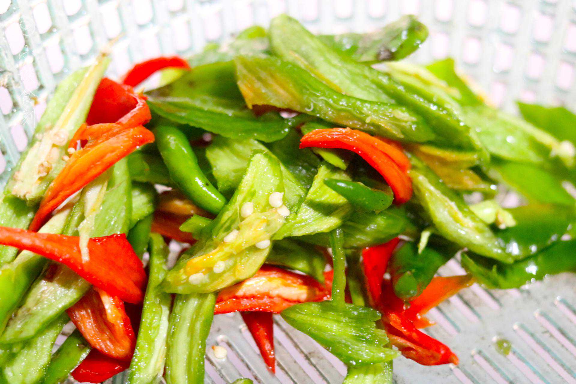 3、锅里放入植物油,烧至7成热的时候,把辣椒放进去炒一下,放入少许的盐,炒好以后,把它盛出来,这样更入味。