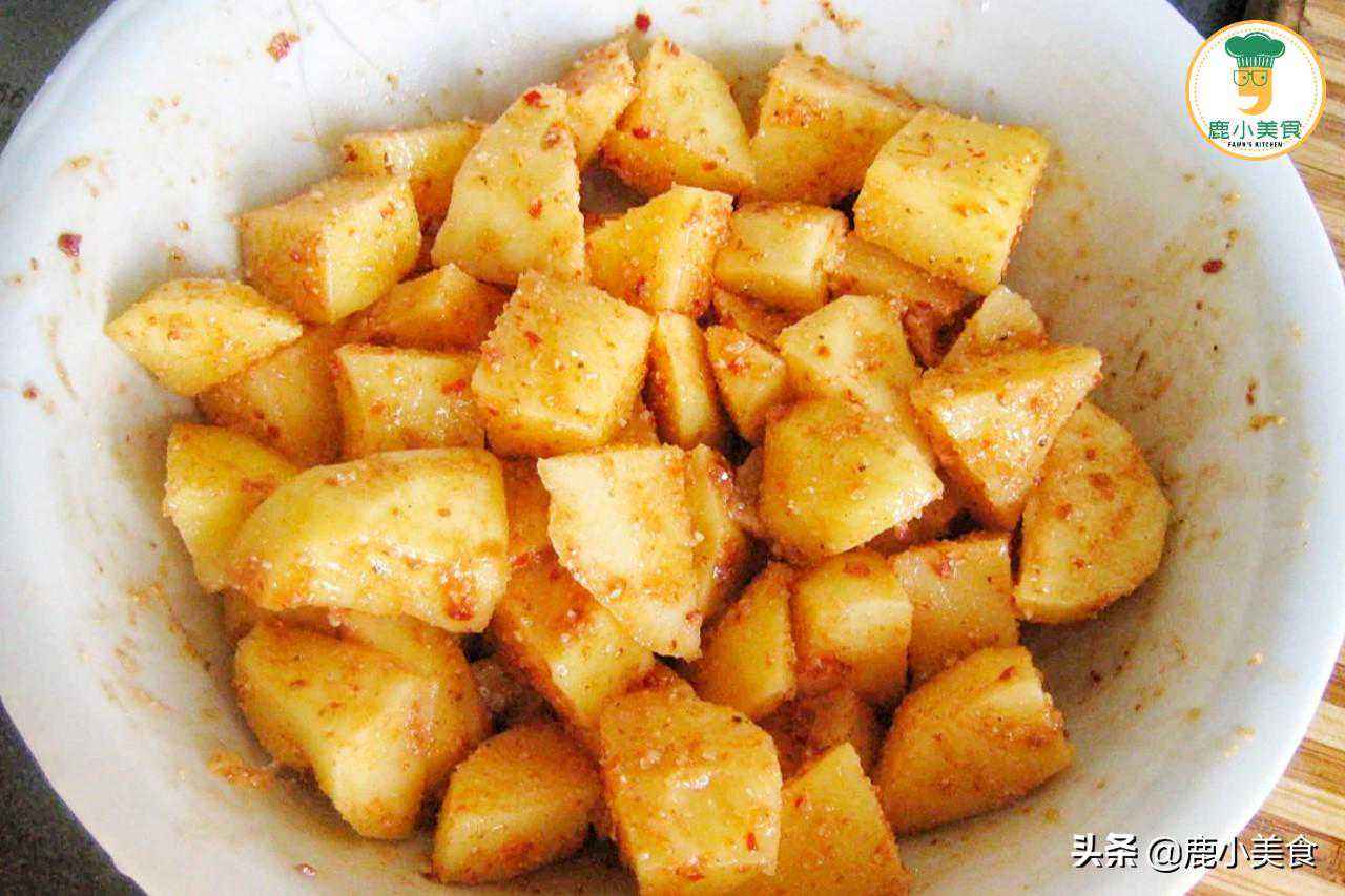 步骤5|腌制排骨时,土豆也可以开始处理了,削皮洗净并切块,加入1/5袋蒸米粉,淋入倒出的排骨腌汁,加少许盐,搅匀。