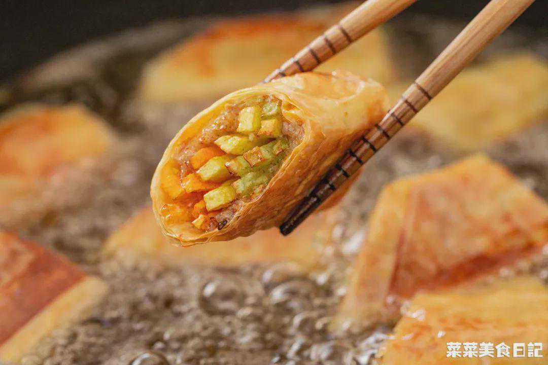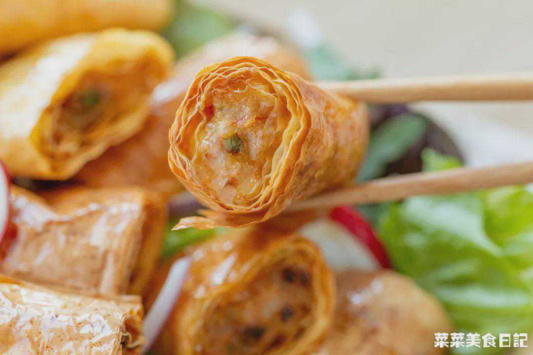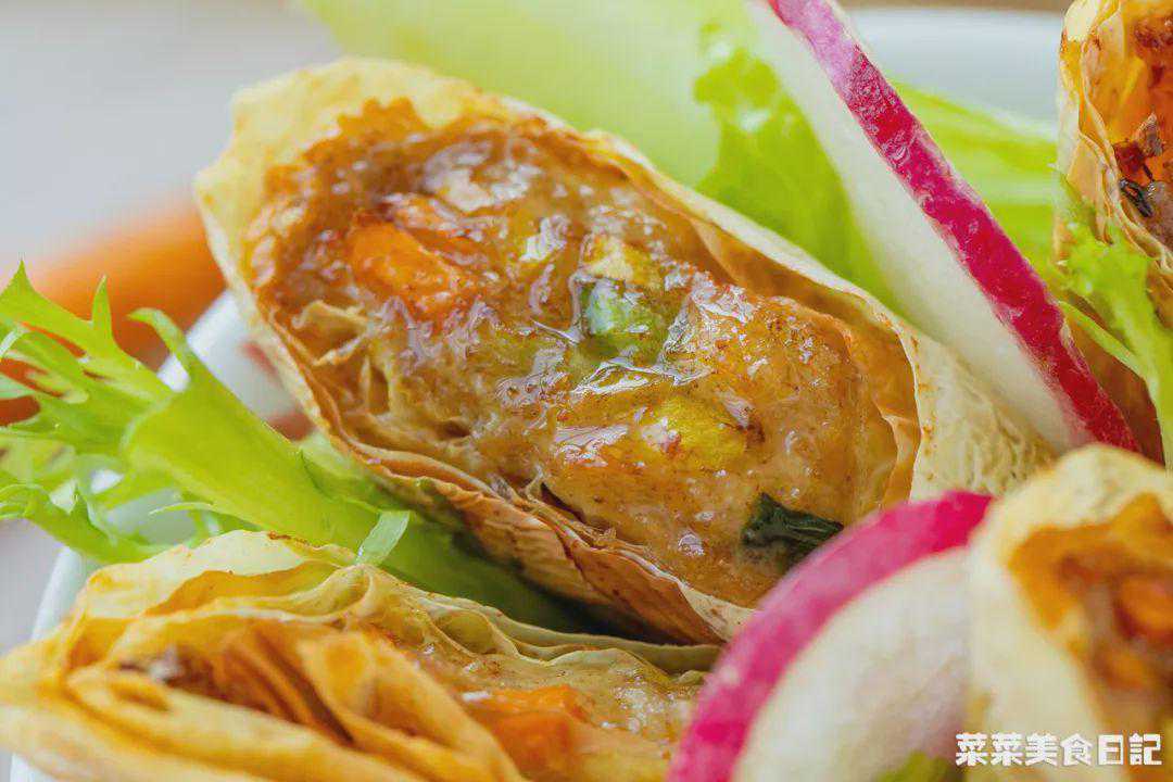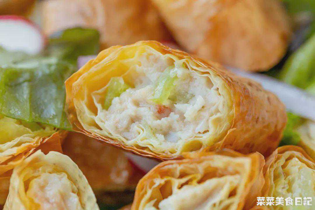 色泽金黄的小圆卷勾人食欲,一咬咔嚓作响,内馅鲜美,馨香四溢。