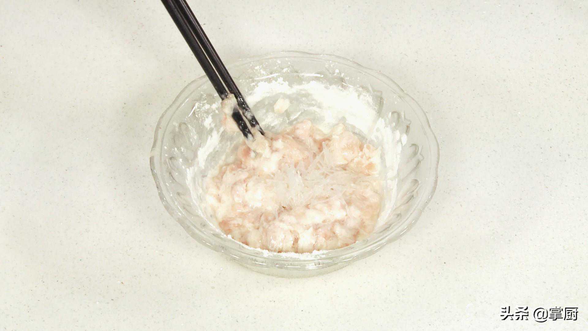 6加入粉丝碎搅匀上劲。