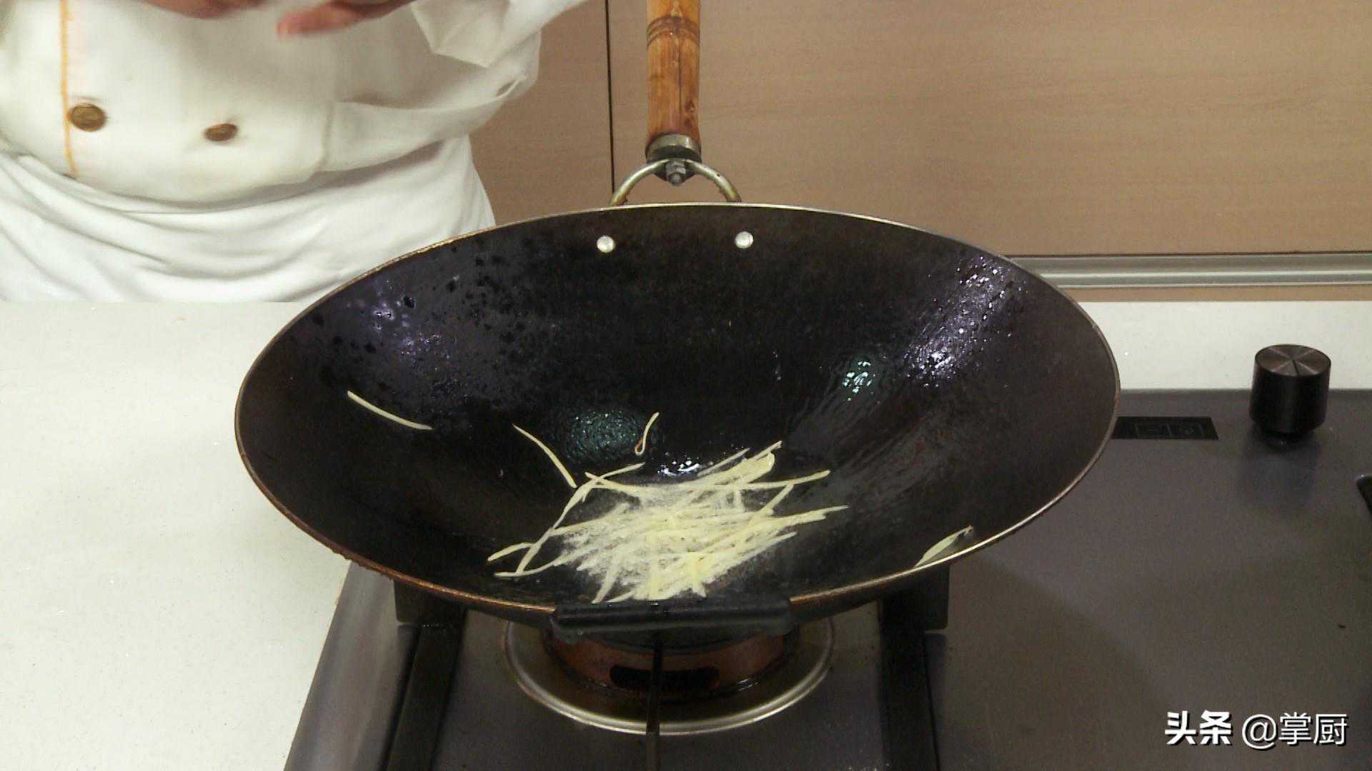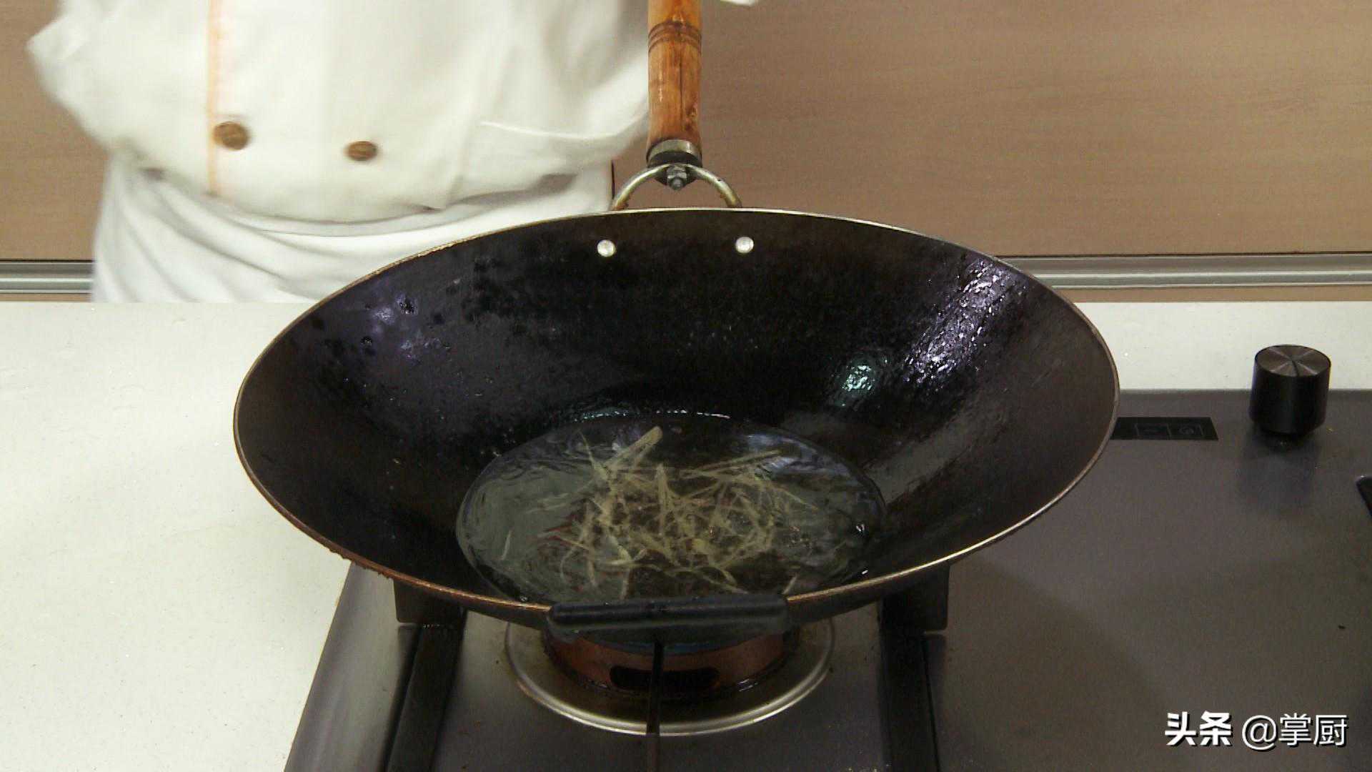 14热锅注油,放入姜丝煸香。