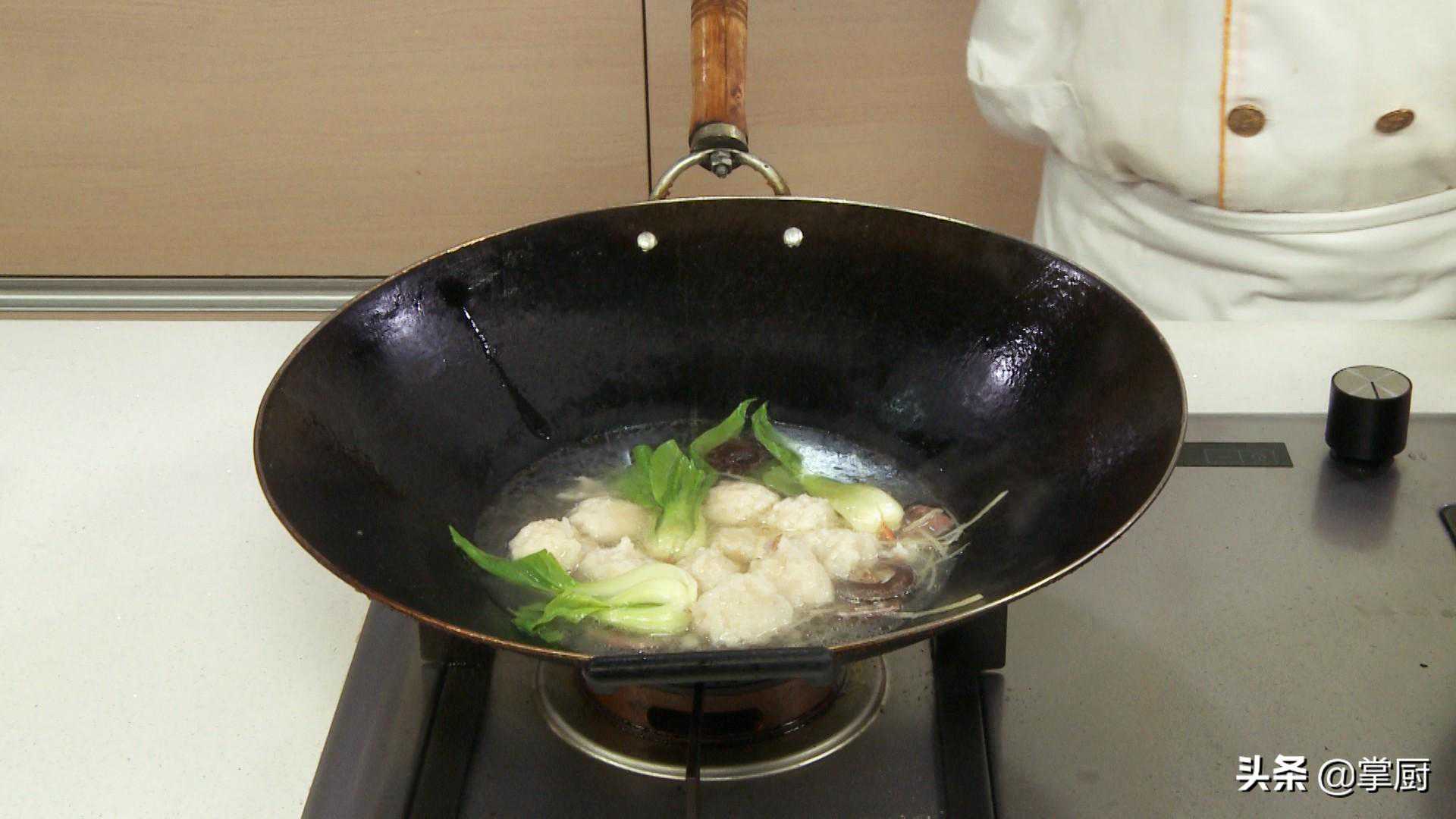 18倒入鱼丸、上海青煮片刻。