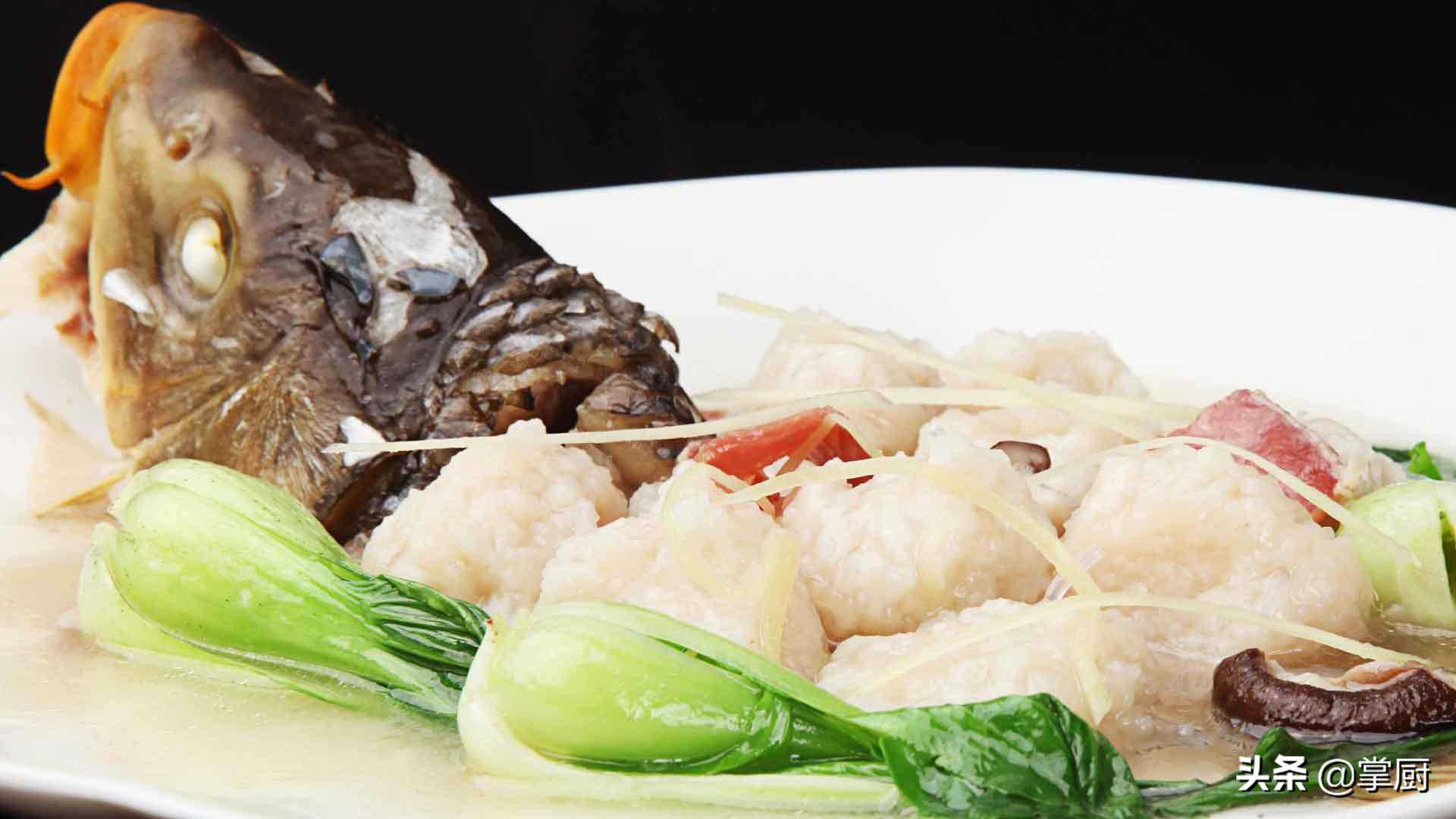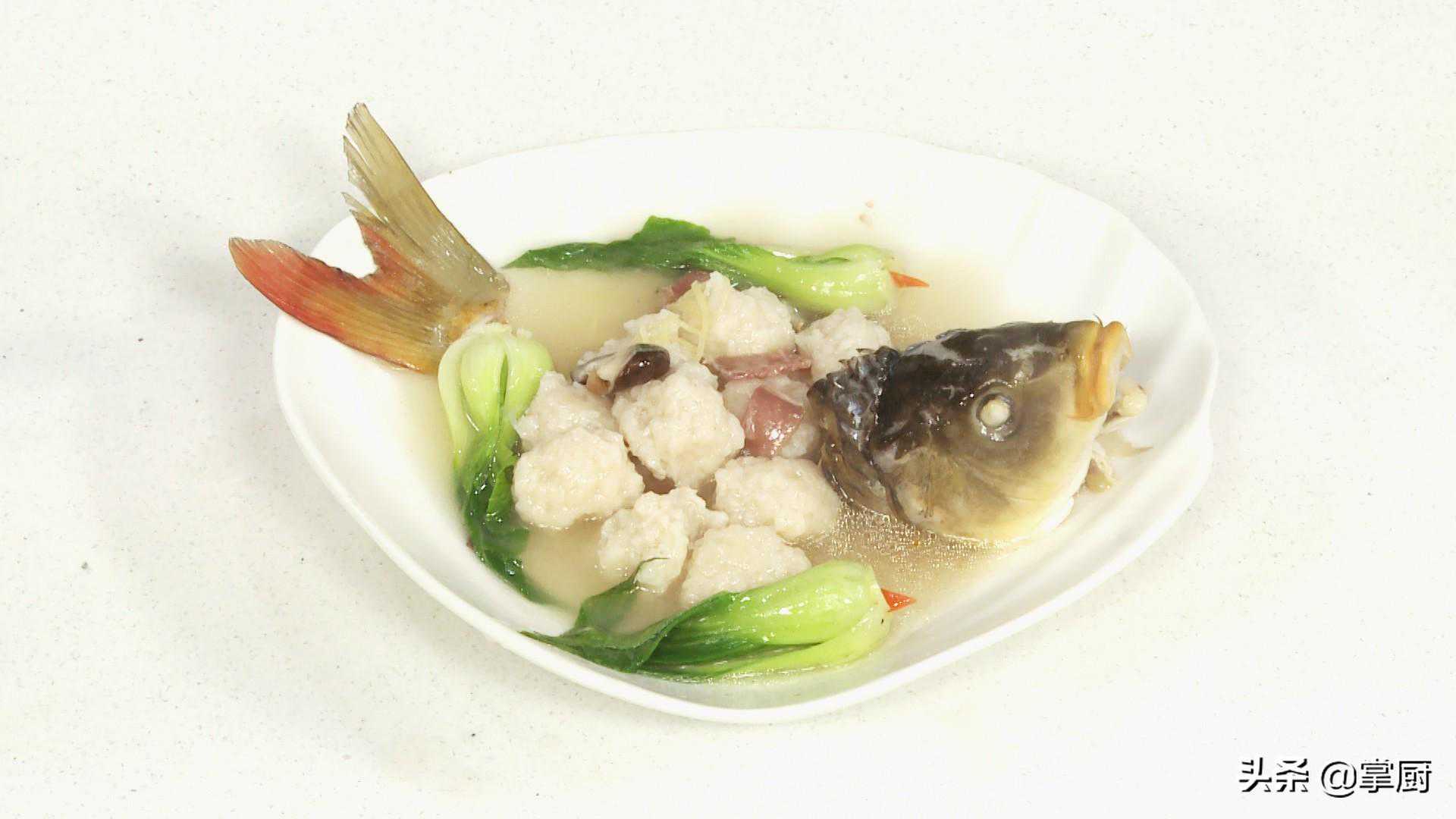 食材准备:鲤鱼750克,肥肉30克,鸡蛋1个,水发粉丝7克,上海青10克,水发香菇少许,火腿片少许,姜丝12克,葱姜酒汁,生粉,胡椒粉,盐,料酒,鸡汤,水淀粉。