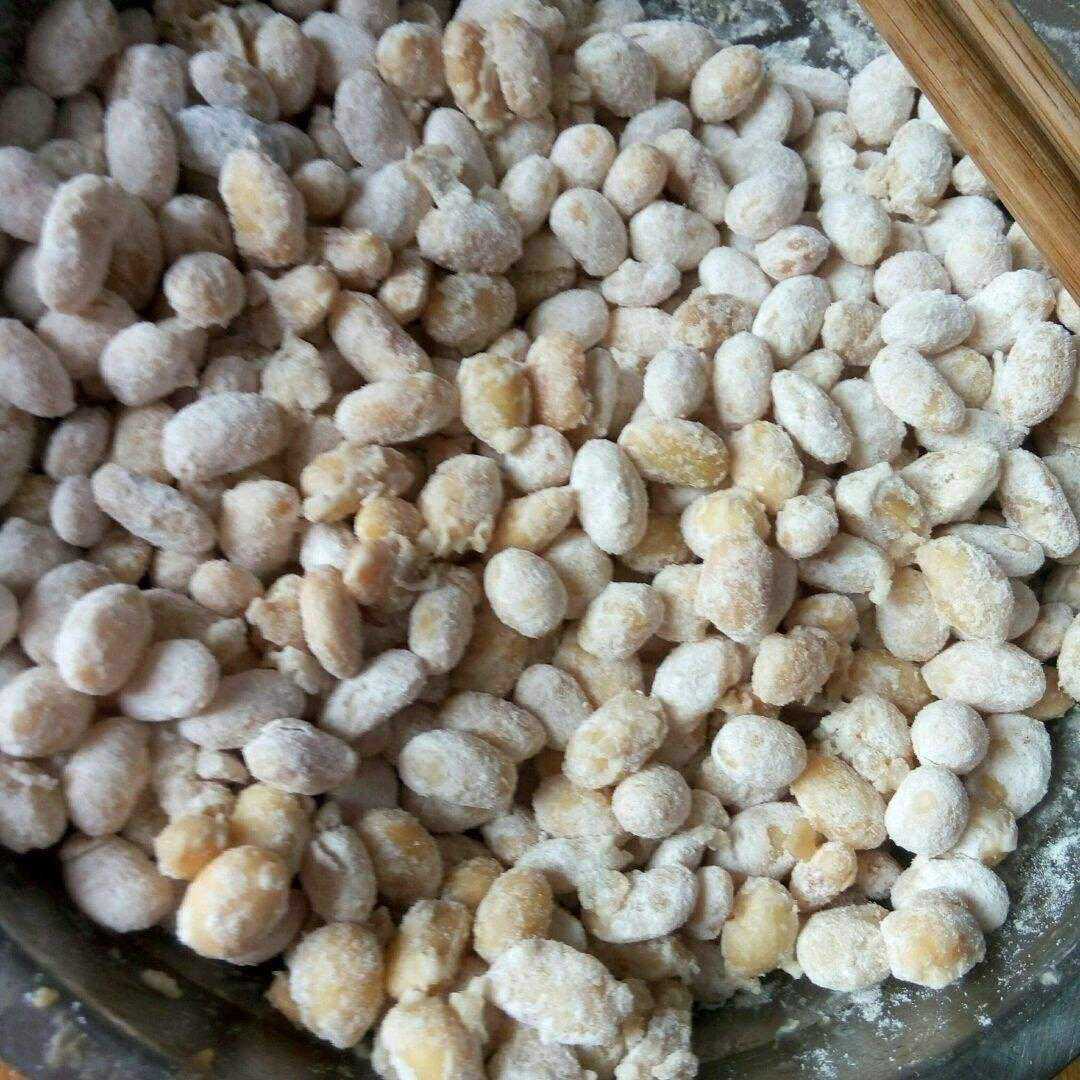步骤二:【裹面粉】在晾好的黄豆上均匀的裹上一层面粉,一粒粒的不能粘连。