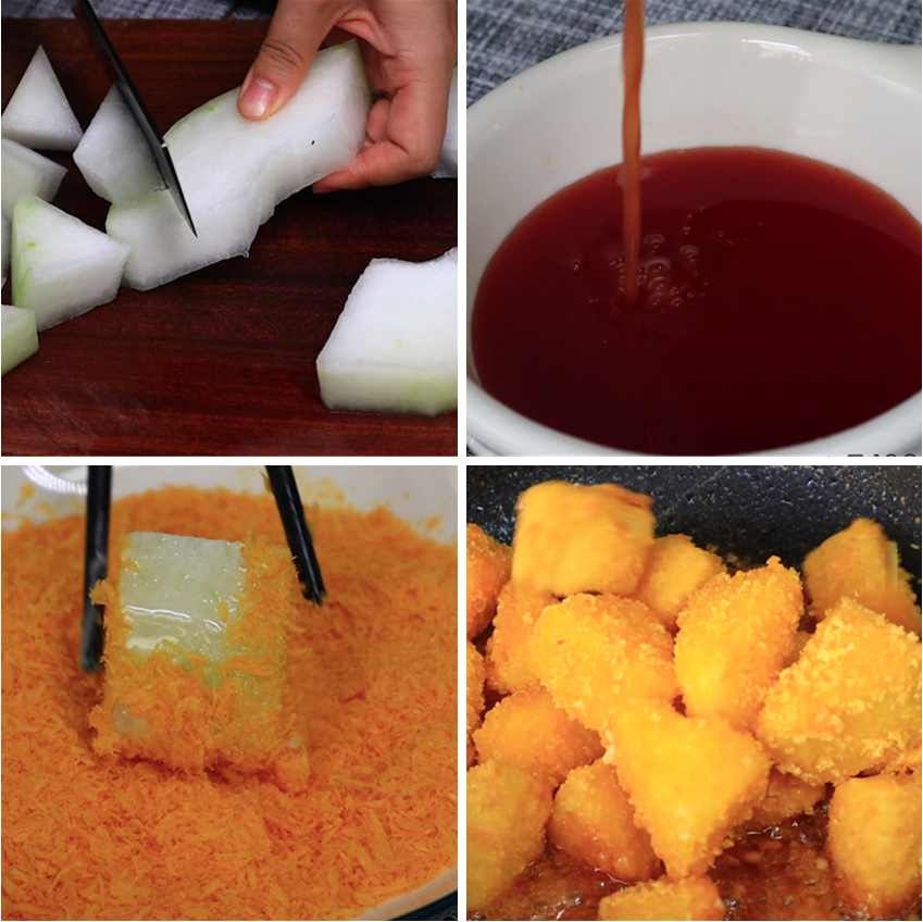 主要食材:冬瓜、鸡蛋、面包糠、糖醋汁、蒜末、葱花