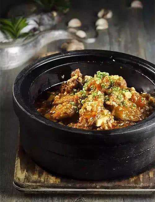 2、把茄子切成一字条,拍粉后直接入油锅炸熟,捞出来和带鱼一起装入石锅,最后浇入滚烫的鱼香味汁并撒上葱花,即可端上桌。
