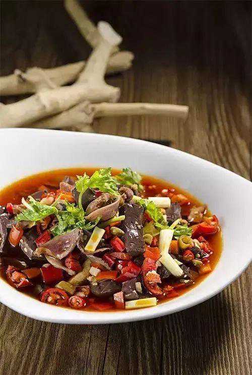 2、净锅里放猪油和菜油烧热,先下泡姜粒、泡豇豆节和蒜米爆香,再下鸡杂炒散籽,边炒边加放美人椒圈和甜椒块,放入鸭血条后烹适量清水,用胡椒粉、十三香、东古酱油、味精、白糖和盐调好味,起锅前撒入芹菜节、香菜节,装盘即成。