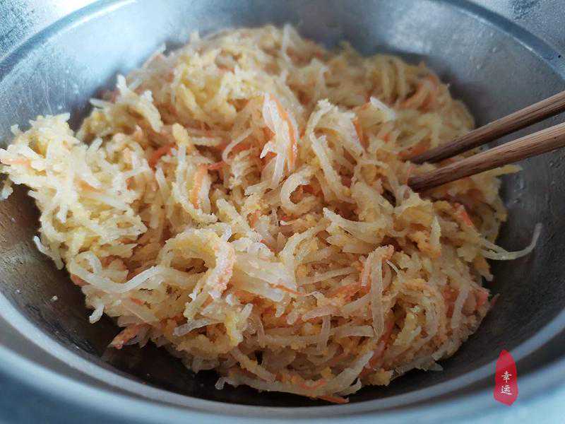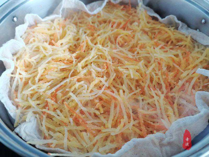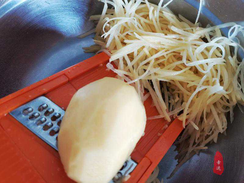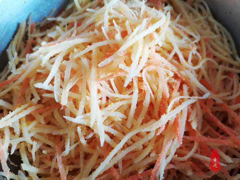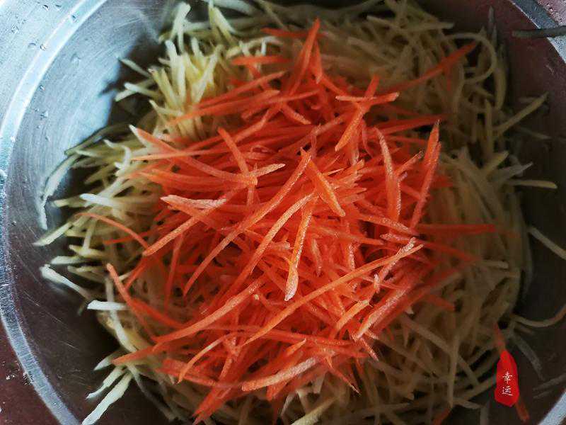 1、土豆去皮洗净擦成丝儿,将它泡在清水里,以便去掉表面过多淀粉;捞出后挤去水分,放入容器里;胡萝卜去皮擦丝与土豆丝放在一个盆里。