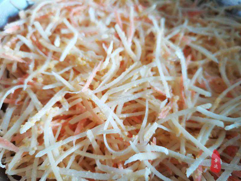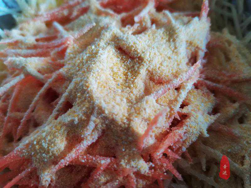 2、给土豆和胡萝卜裹玉米面和面粉时,要少量多次加入;裹好后不沾手即可,但千万别过量哦。
