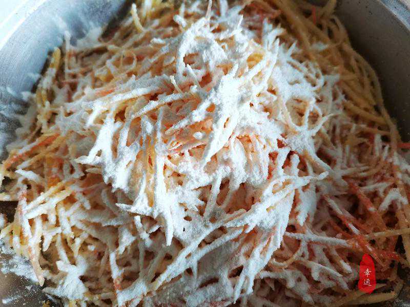 3、白面也同样使用少量多次的方法,让土豆和胡萝卜都均匀地挂上一层面粉,主要起到黏合的作用。