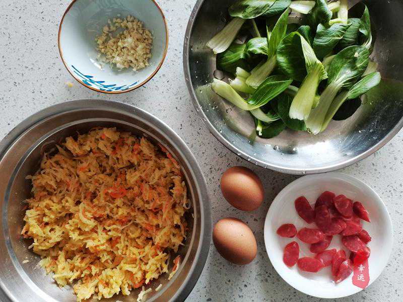 主要食材:土豆2个、半根胡萝卜、玉米面、白面、鸡蛋、油菜、蒜末、盐、食用油、生抽、醋适量