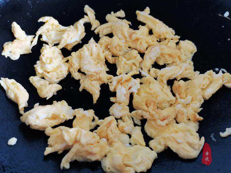 7、将油菜择好洗净;香肠切成片状;2个鸡蛋打入碗中,搅散;炒锅烧热倒入食用油,油热倒入蛋液,炒成鸡蛋块。