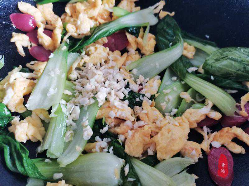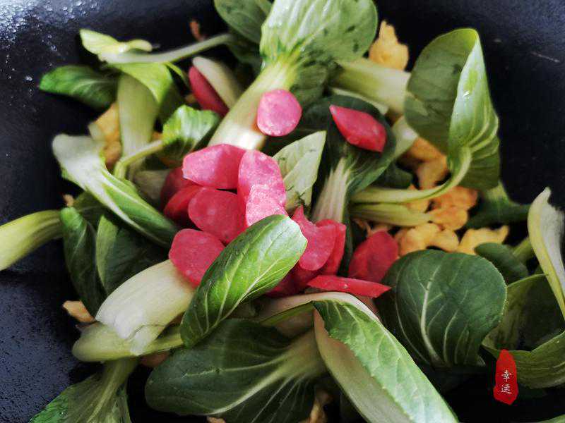 8、油菜、香肠下锅中,用铲子翻炒;油菜变软时,撒入蒜末。