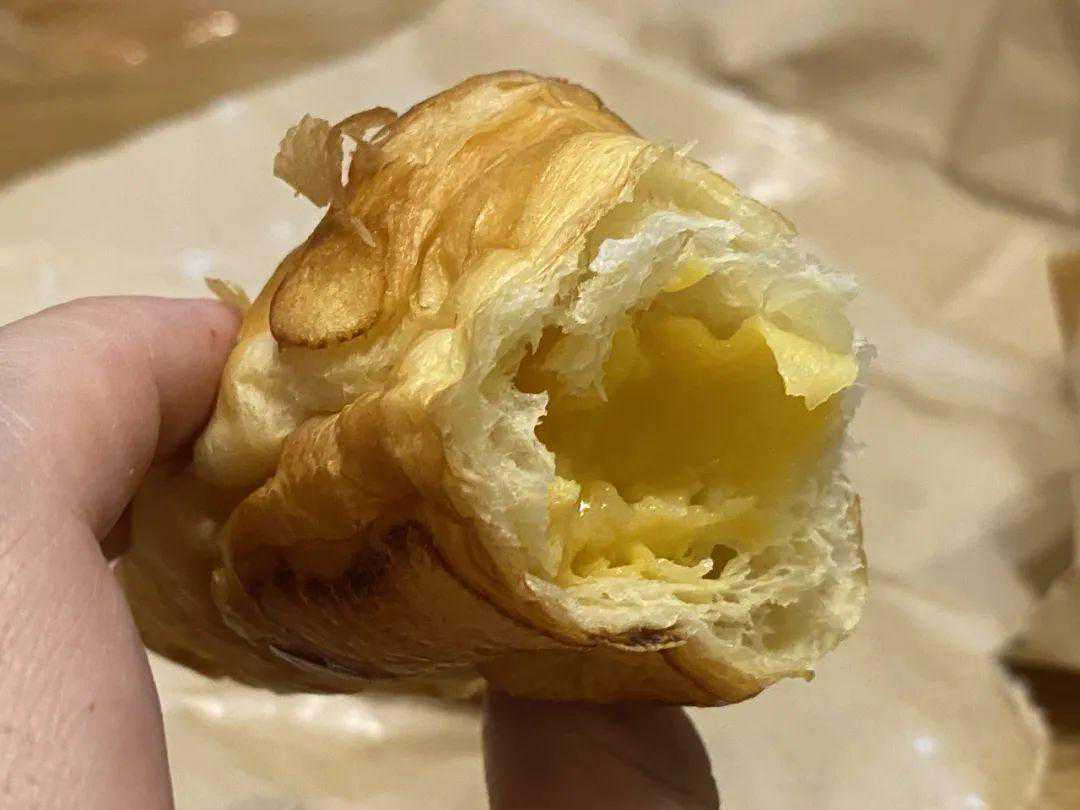 金黄色的咸蛋黄流出,降低了牛角包的单调,渗透进面包里,会出现颗粒感,@阿七表示,“有一种金沙玉米的感觉”。