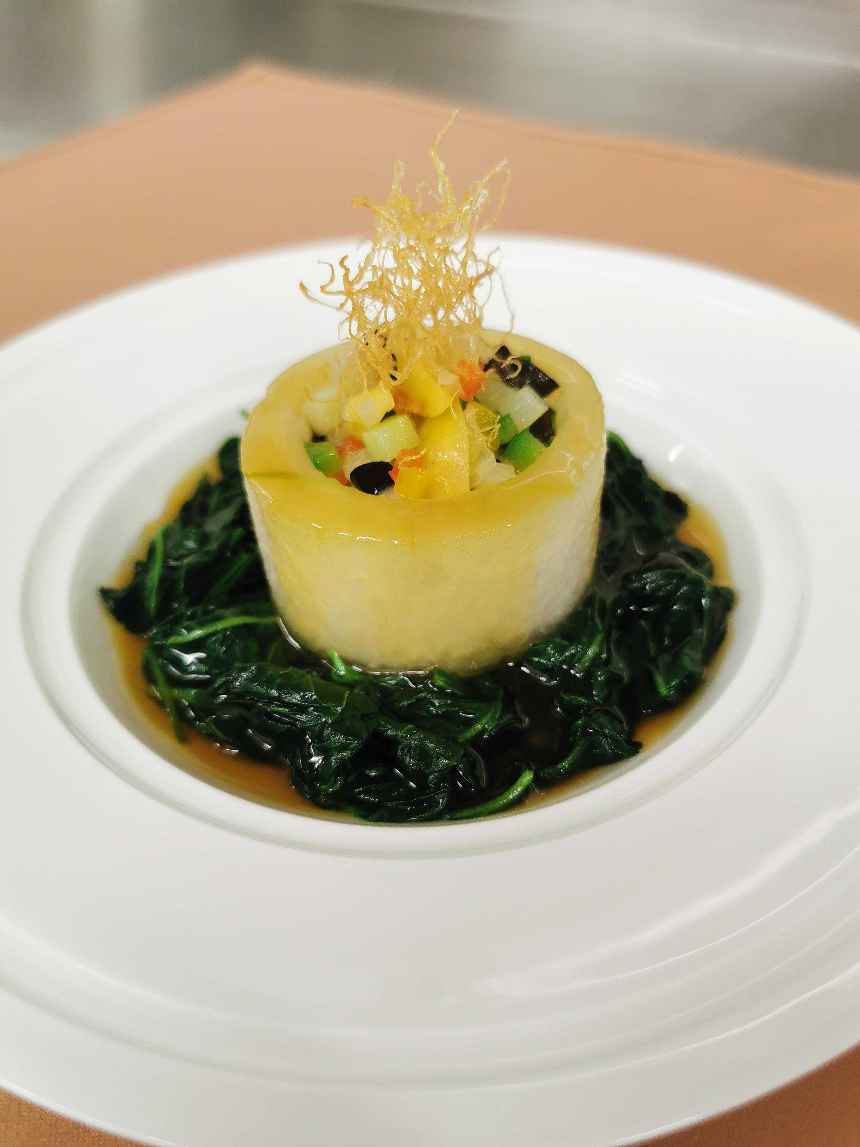 龙庭琇厨另外一款“翠田种玉”则专为素食爱好者而设:用高汤煨软的冬瓜环,里面盛满先用镬爆香的鲜爽木耳、黄耳、雪耳、青椒、黄椒、红椒、芦笋粒,而衬底是餐厅当天最鲜嫩软滑的绿叶时菜,可以是辣椒叶、苋菜、芝麻菜、枸杞叶……上桌之前浇一小勺超浓缩秘制上汤、顶上撒一小撮香脆提神的炸姜丝,虽是全素,口感却十分丰富,味道鲜爽香甜。