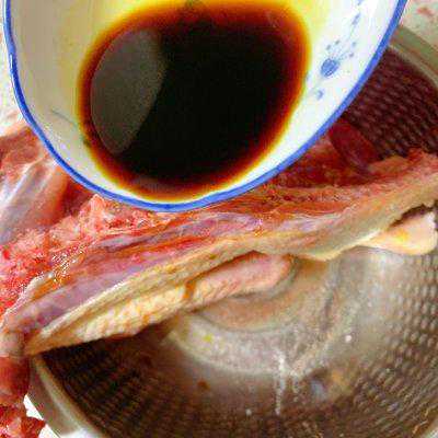 4、把盐,6月鲜特级酱油以及2克6月鲜红烧酱油均匀的涂抹在鸭子上,外面里面都涂哦^_^