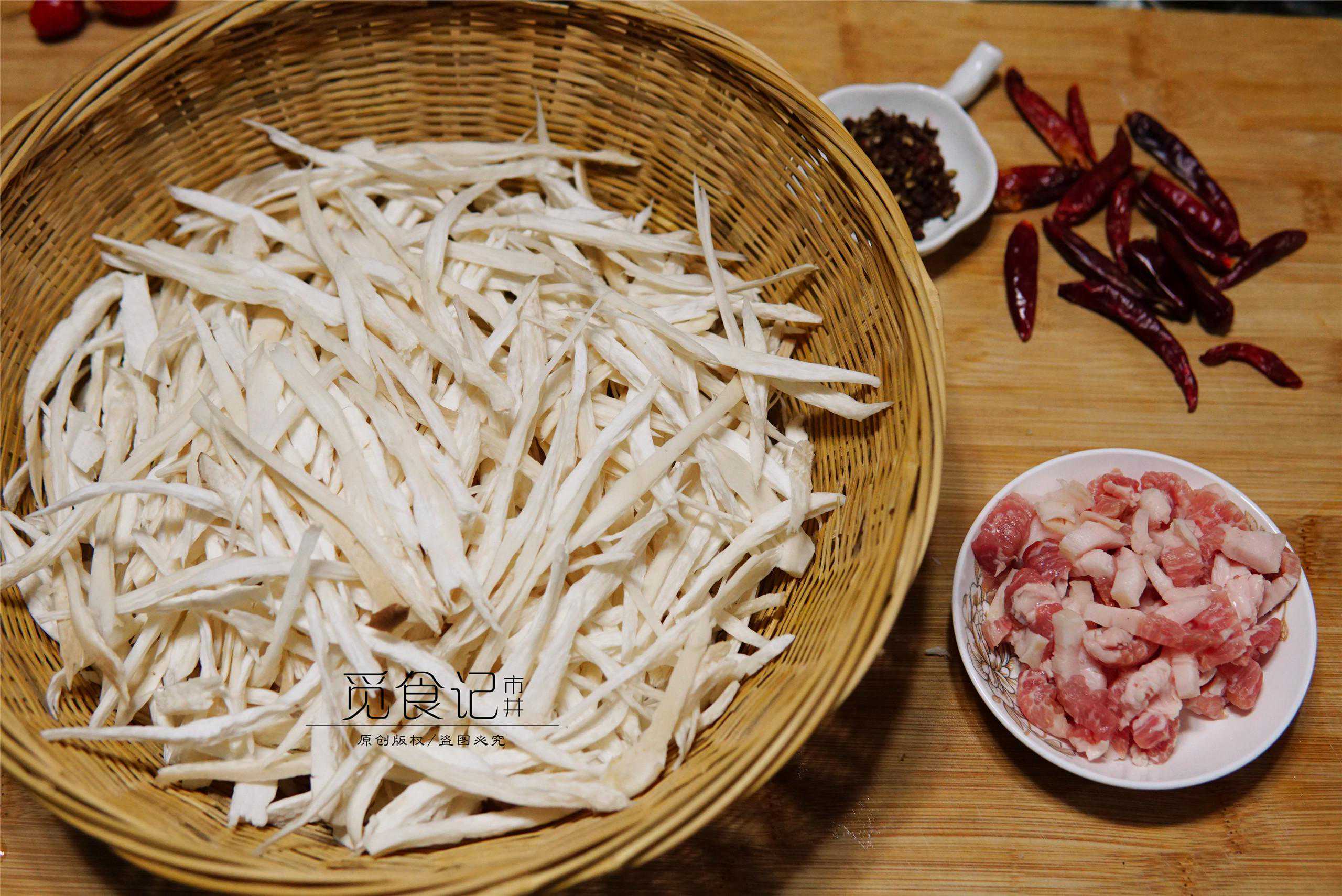 第一步处理食材,杏鲍菇洗干净后,切除两端一部分,用手将杏鲍菇撕成长条备用。五花肉切丝备用。